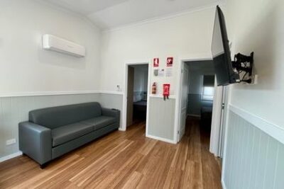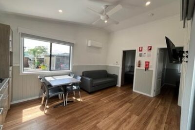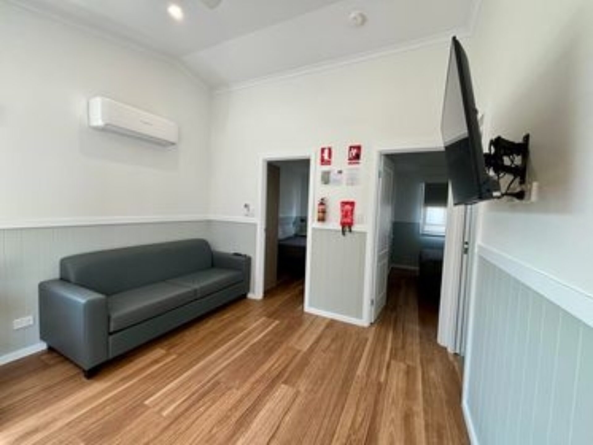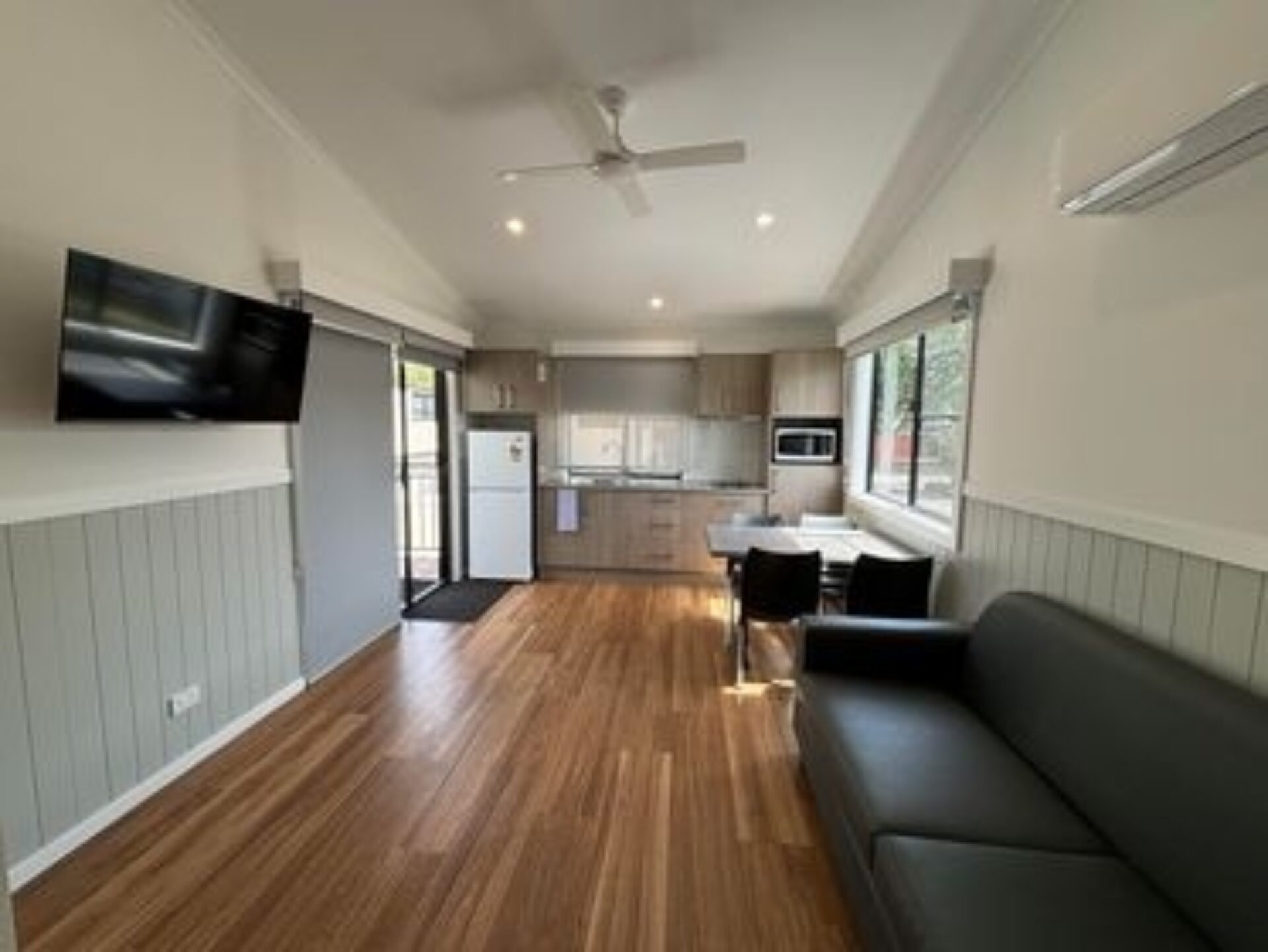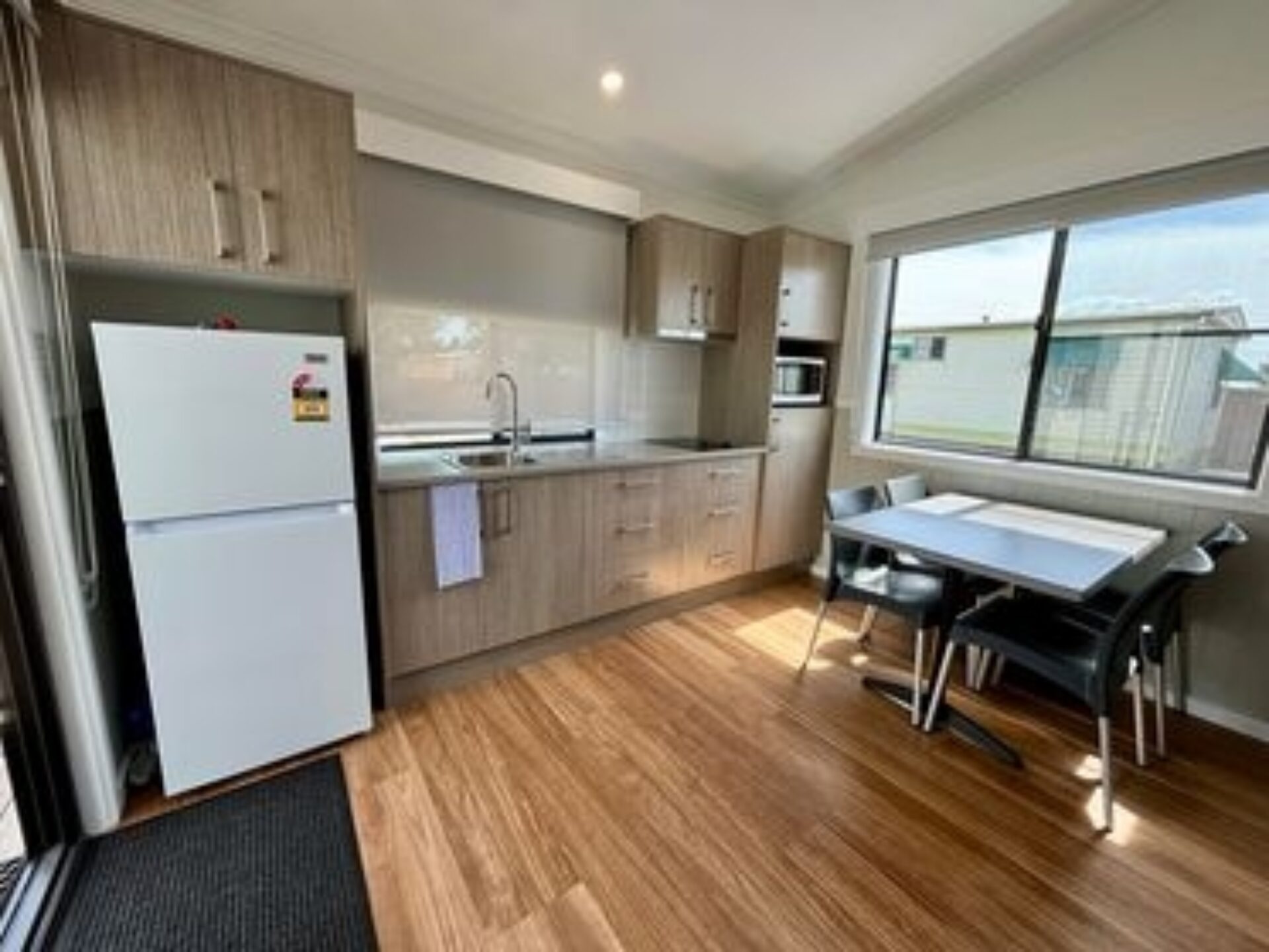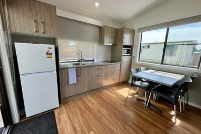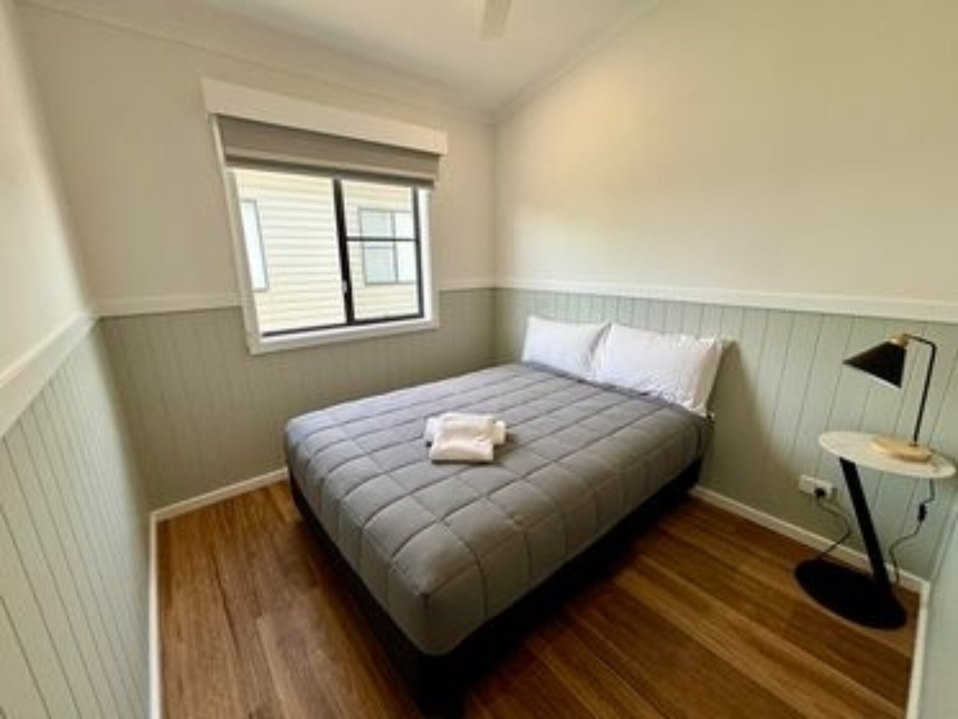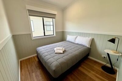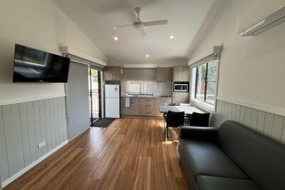 This two-bedroom villa sleeps up to four guests with a double bed in each room. The open-plan layout includes a modern kitchen with electric stovetop, microwave, and full-size fridge, along with a combined lounge and dining area. Air-conditioning and ceiling fans provide year-round comfort, making it an ideal option for families or small groups.