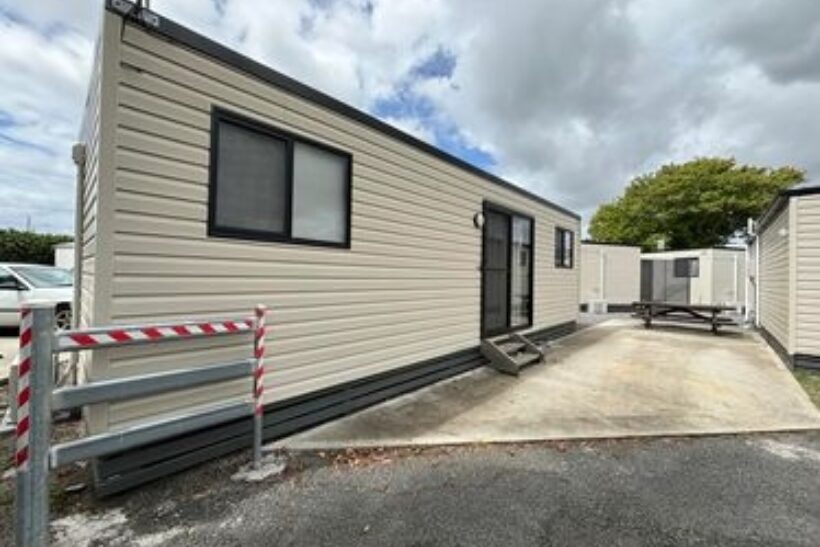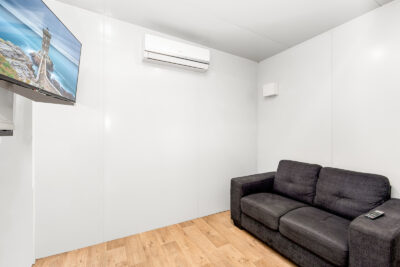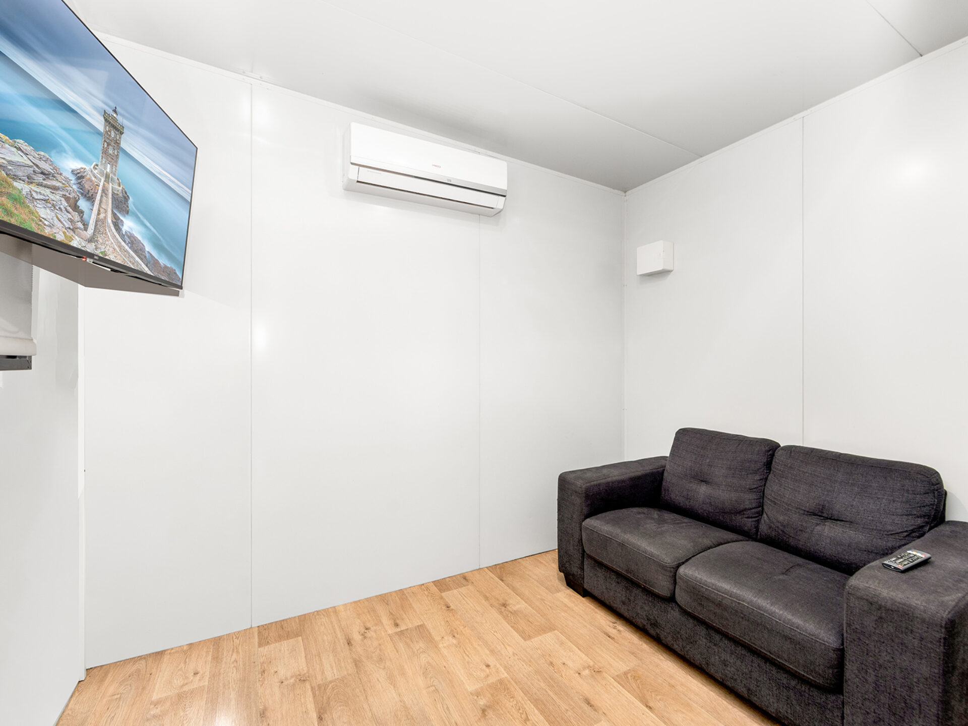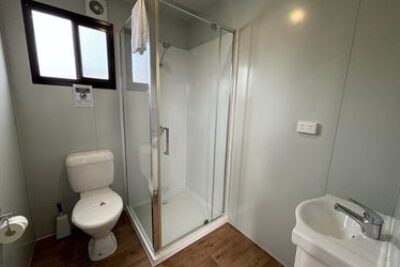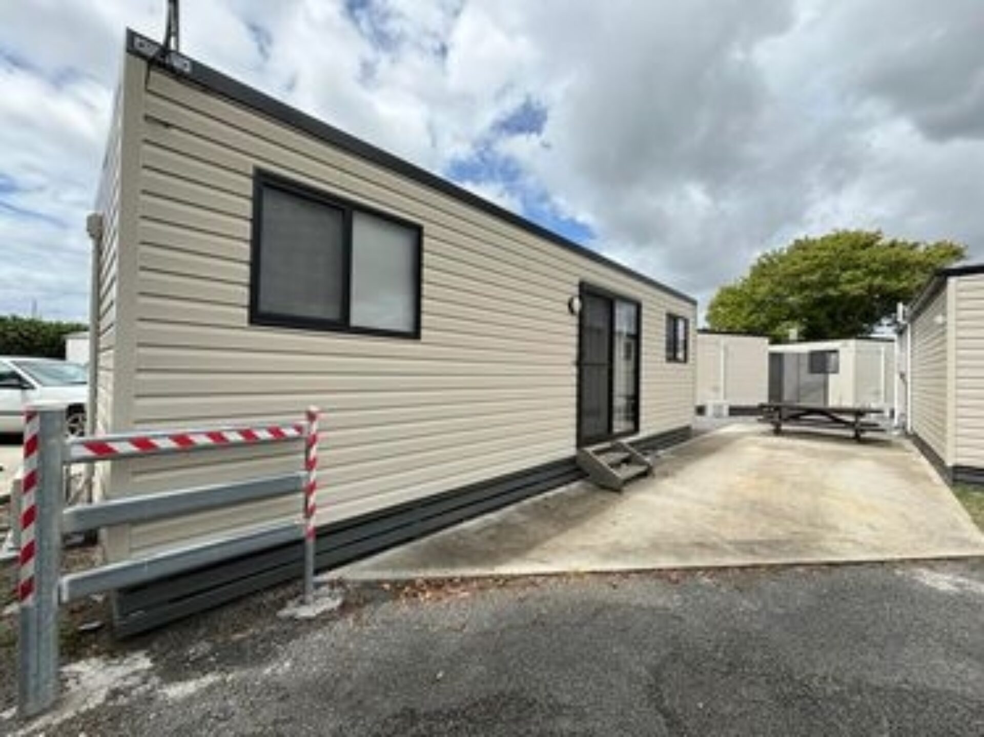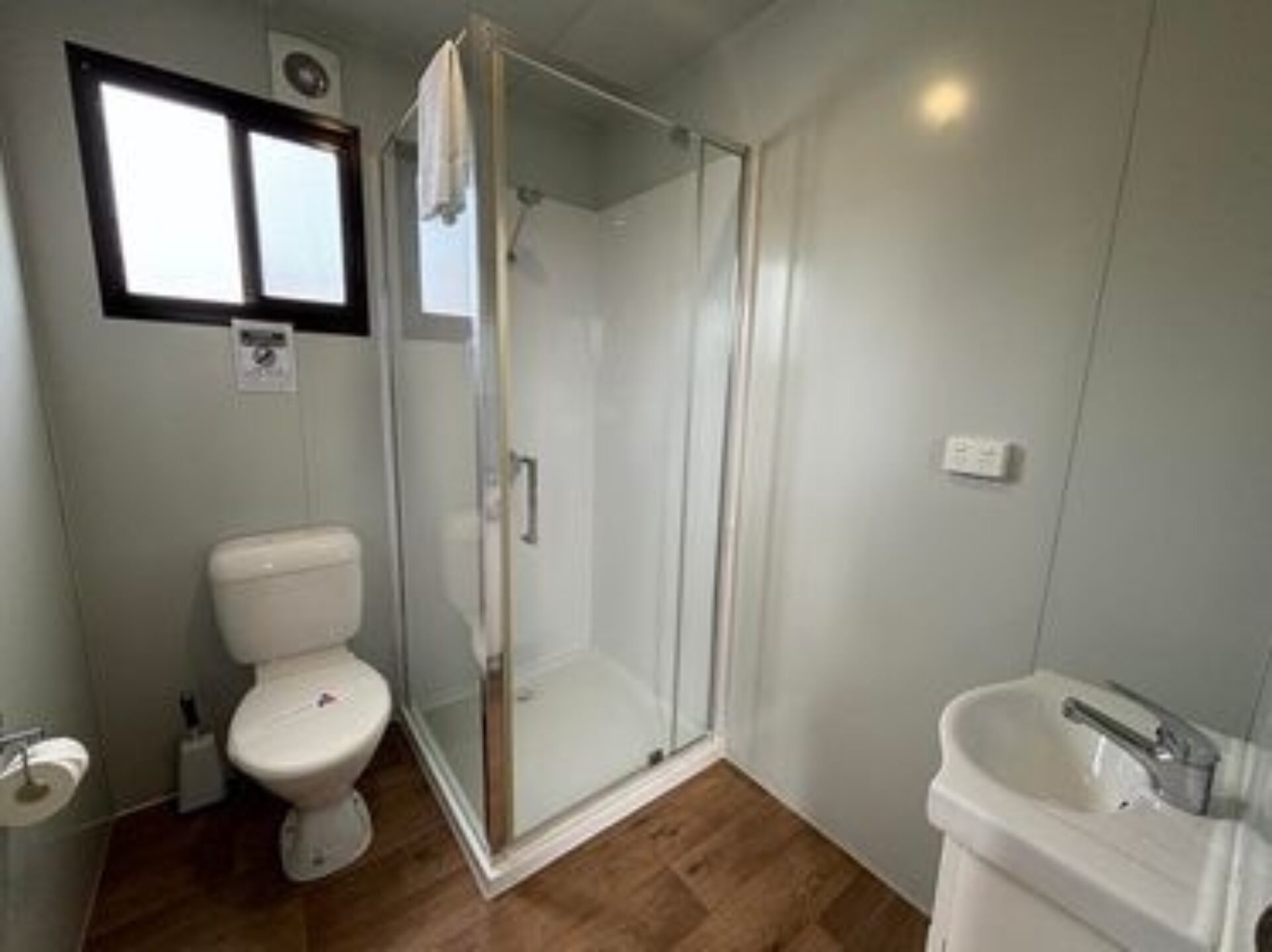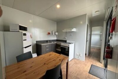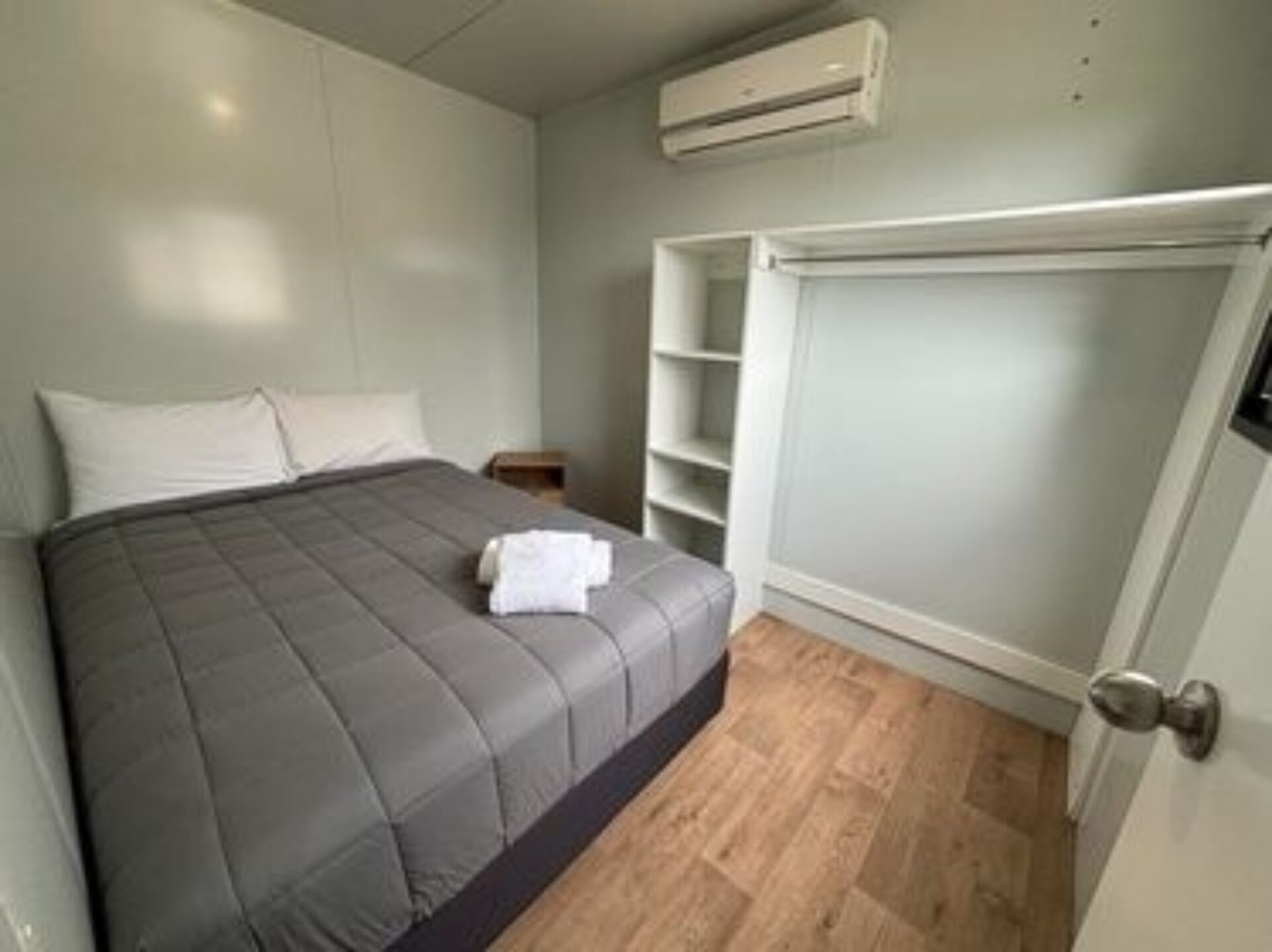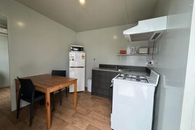 This one-bedroom cabin sleeps two guests in a double bed and features a separate lounge area, both with air-conditioning. The full kitchen includes a gas oven, gas stovetop, microwave, and full-size fridge. The kitchen and dining area offers a comfortable space for dining indoors.