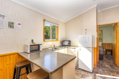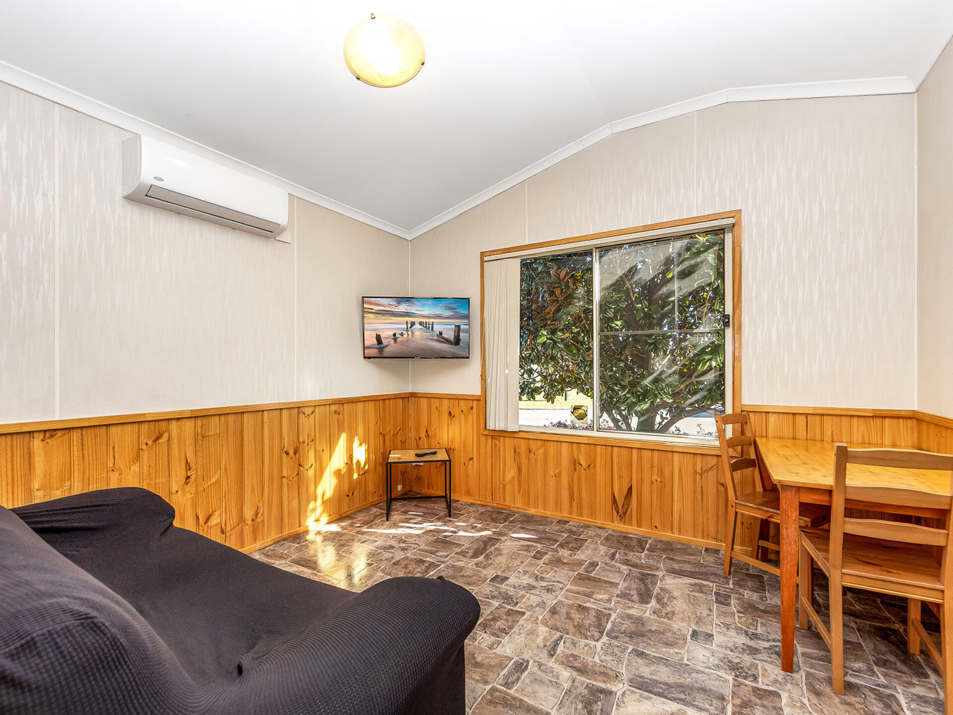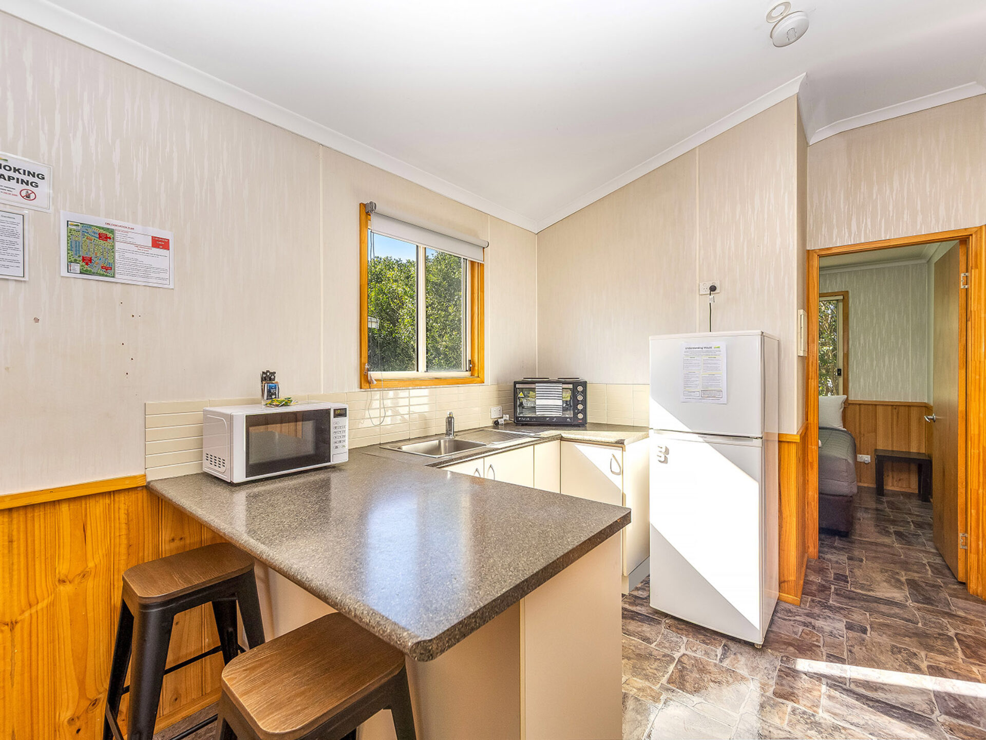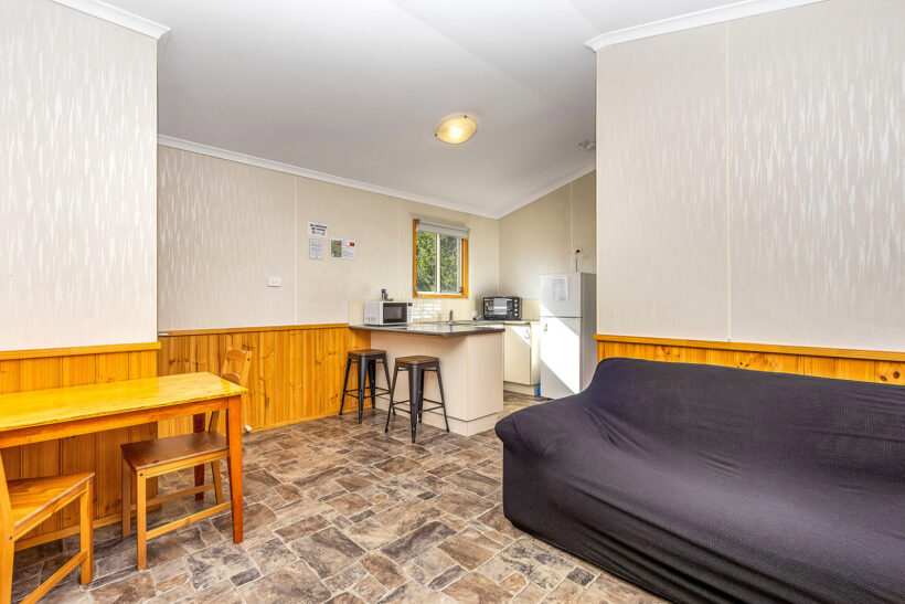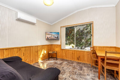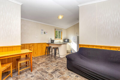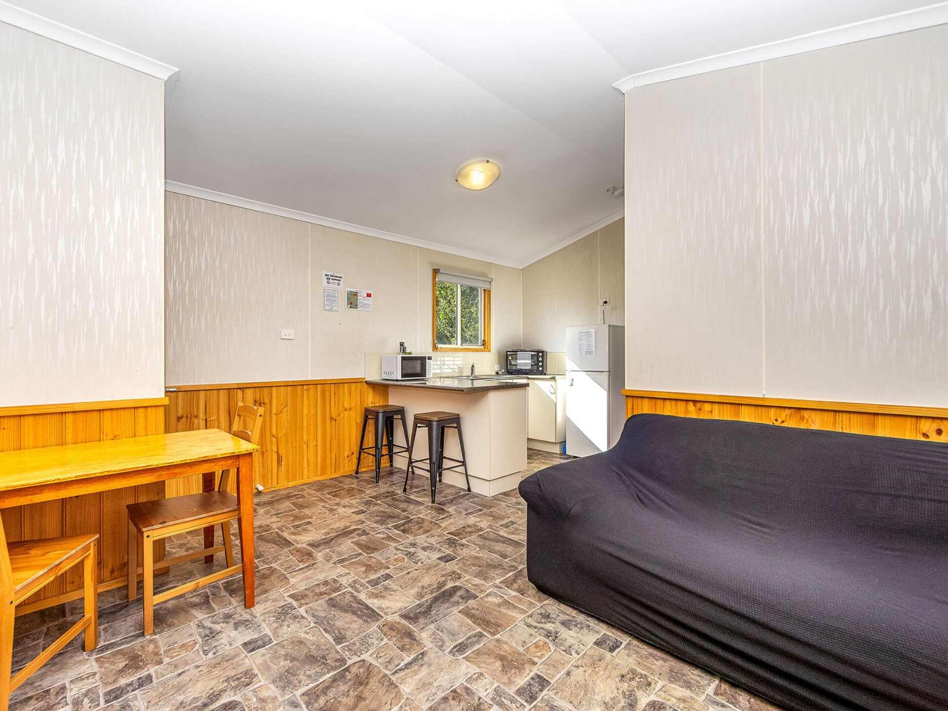 This two-bedroom cabin sleeps up to three guests with one double bed and one king single bed. It includes a kitchenette with electric or gas stovetop, microwave, and full-size fridge. The air-conditioned living and dining area offers a comfortable space for relaxing or dining indoors.