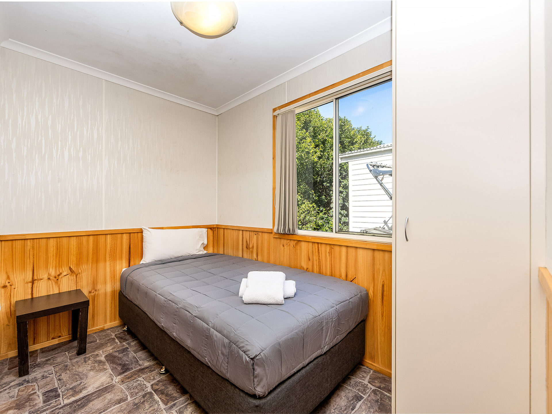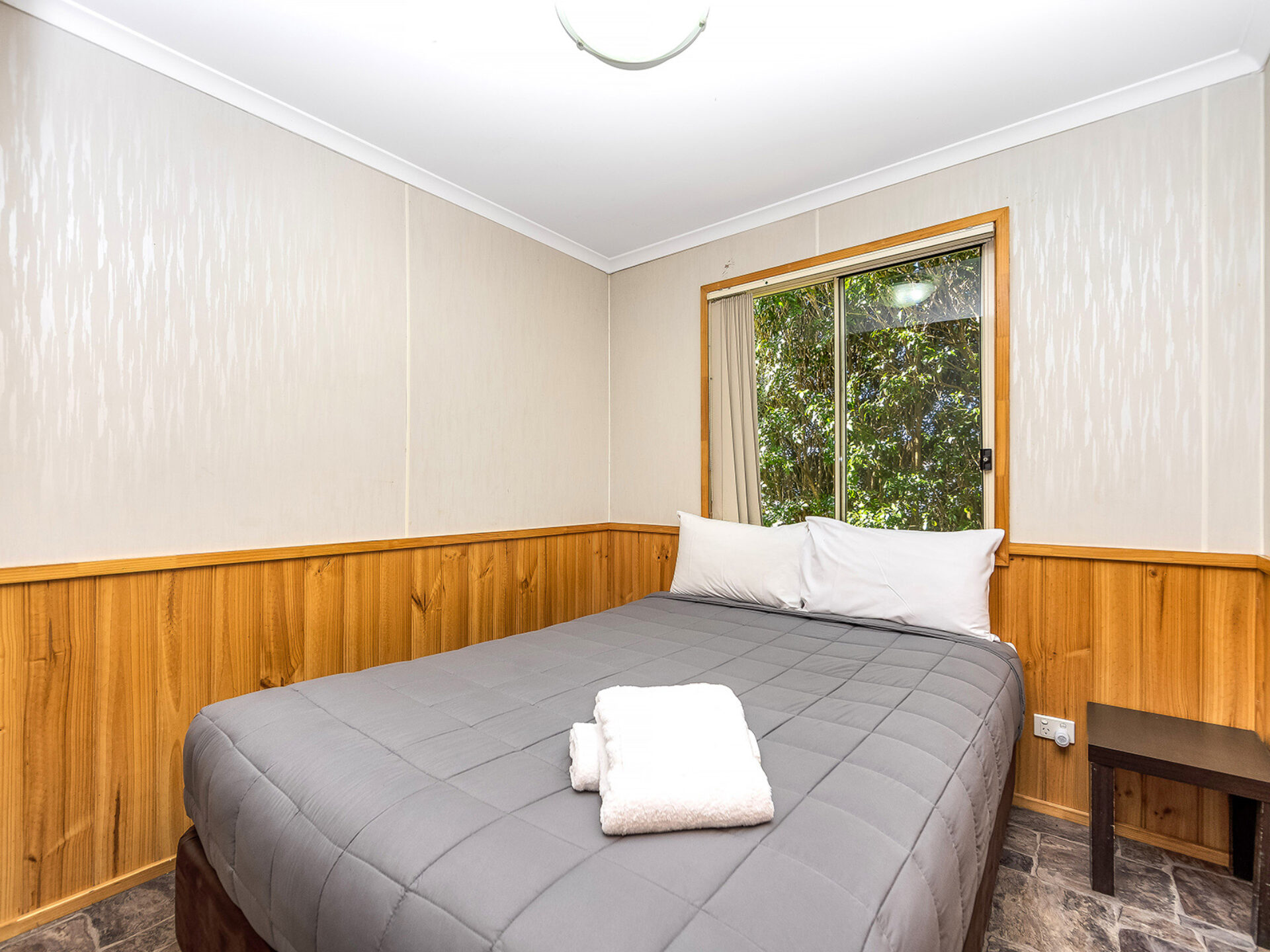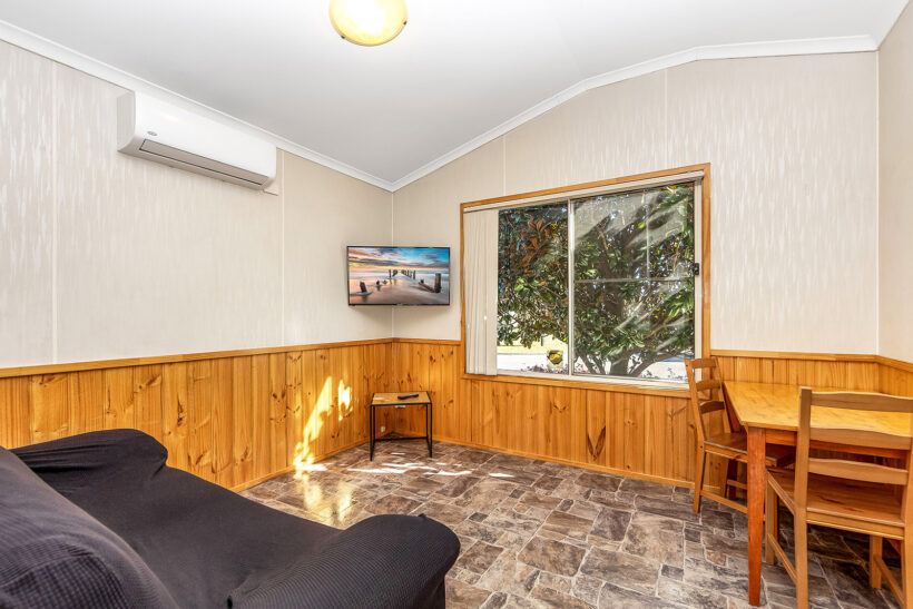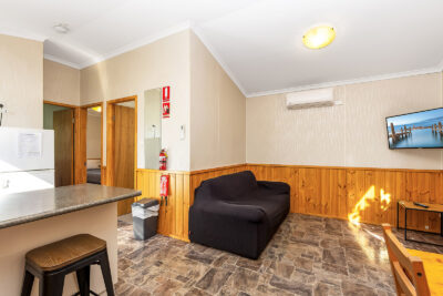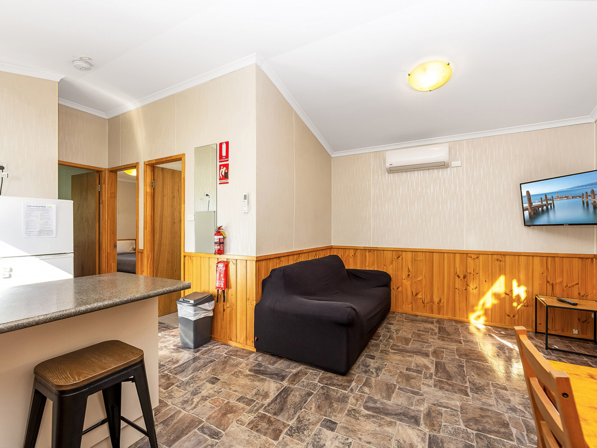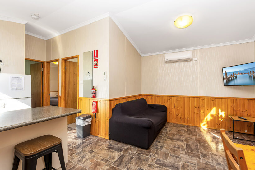 This two-bedroom cabin sleeps up to three guests with one double bed and one king single bed. It includes a kitchenette with electric or gas stovetop, microwave, and full-size fridge. The air-conditioned living and dining area offers a comfortable space for relaxing or dining indoors.