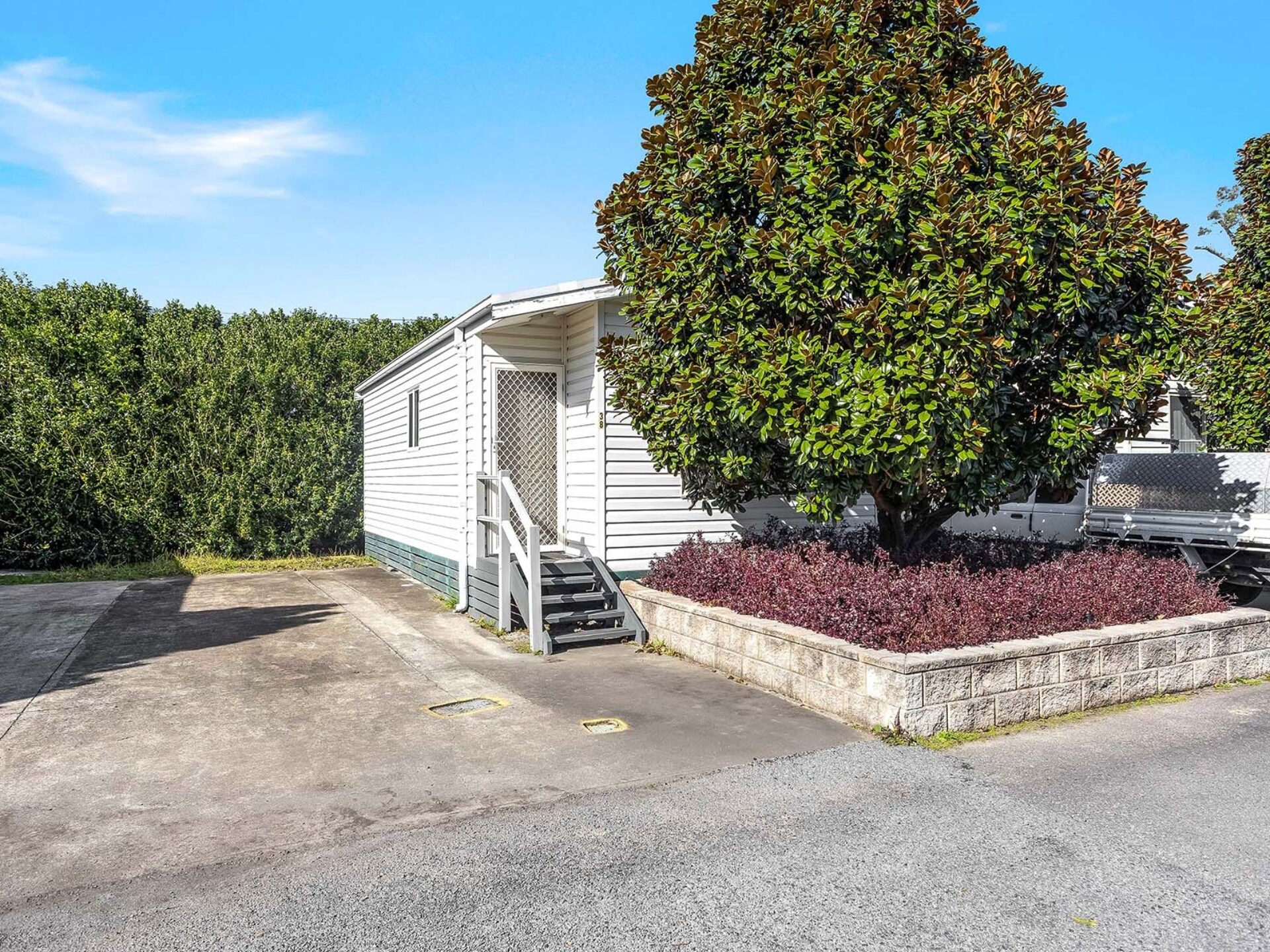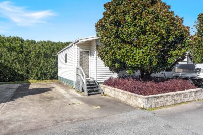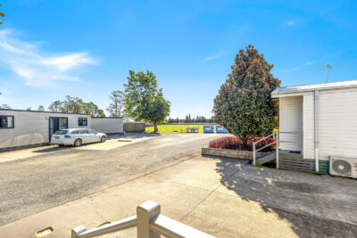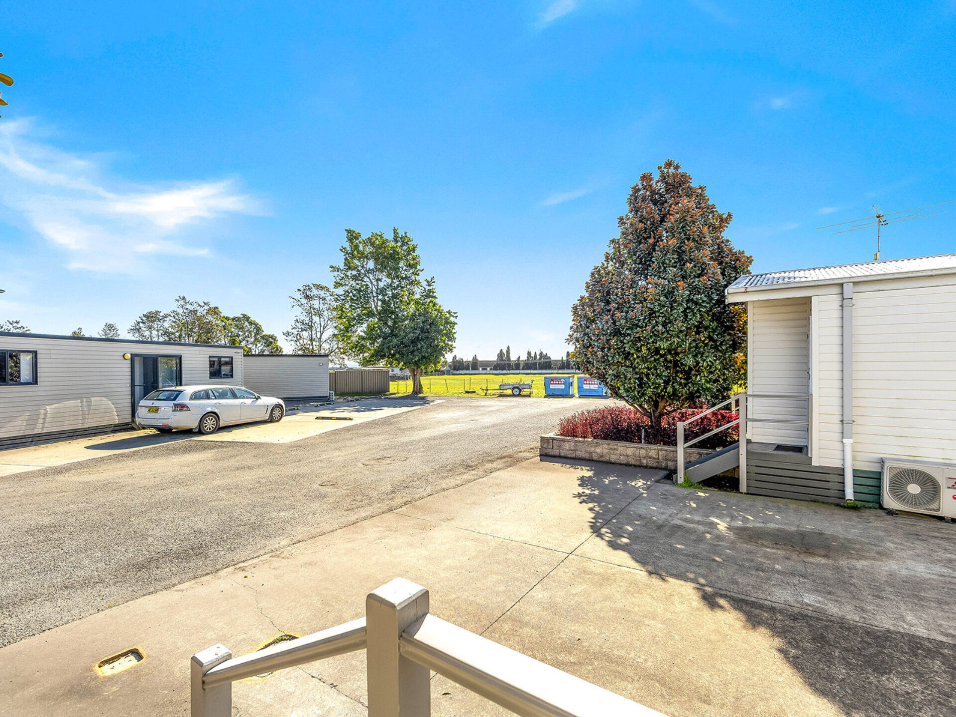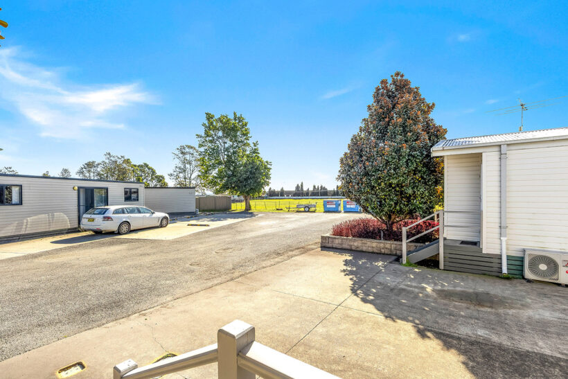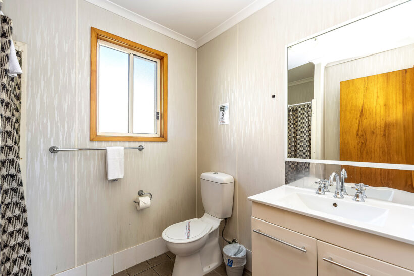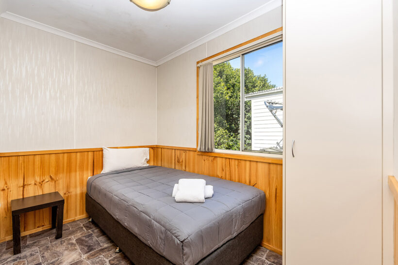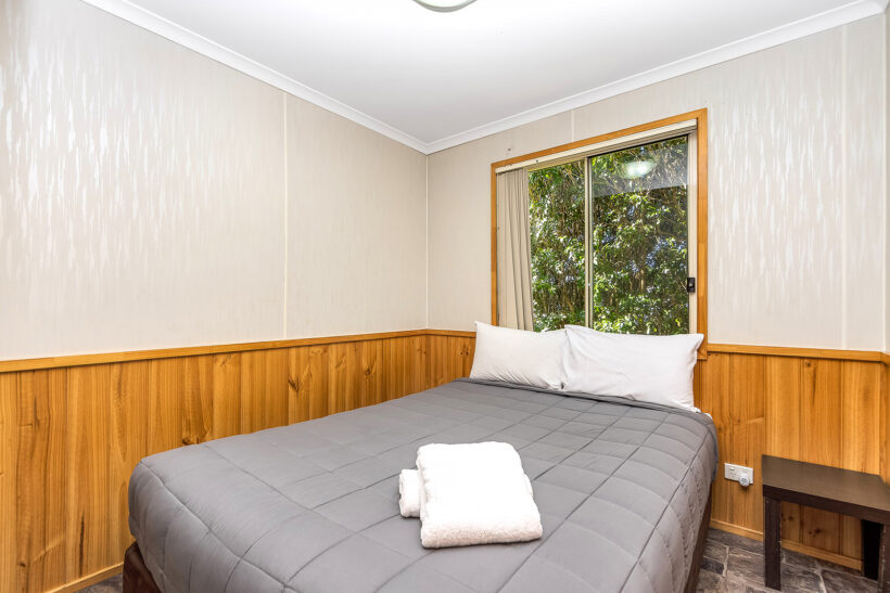 This two-bedroom cabin sleeps up to three guests with one double bed and one king single bed. It includes a kitchenette with electric or gas stovetop, microwave, and full-size fridge. The air-conditioned living and dining area offers a comfortable space for relaxing or dining indoors.