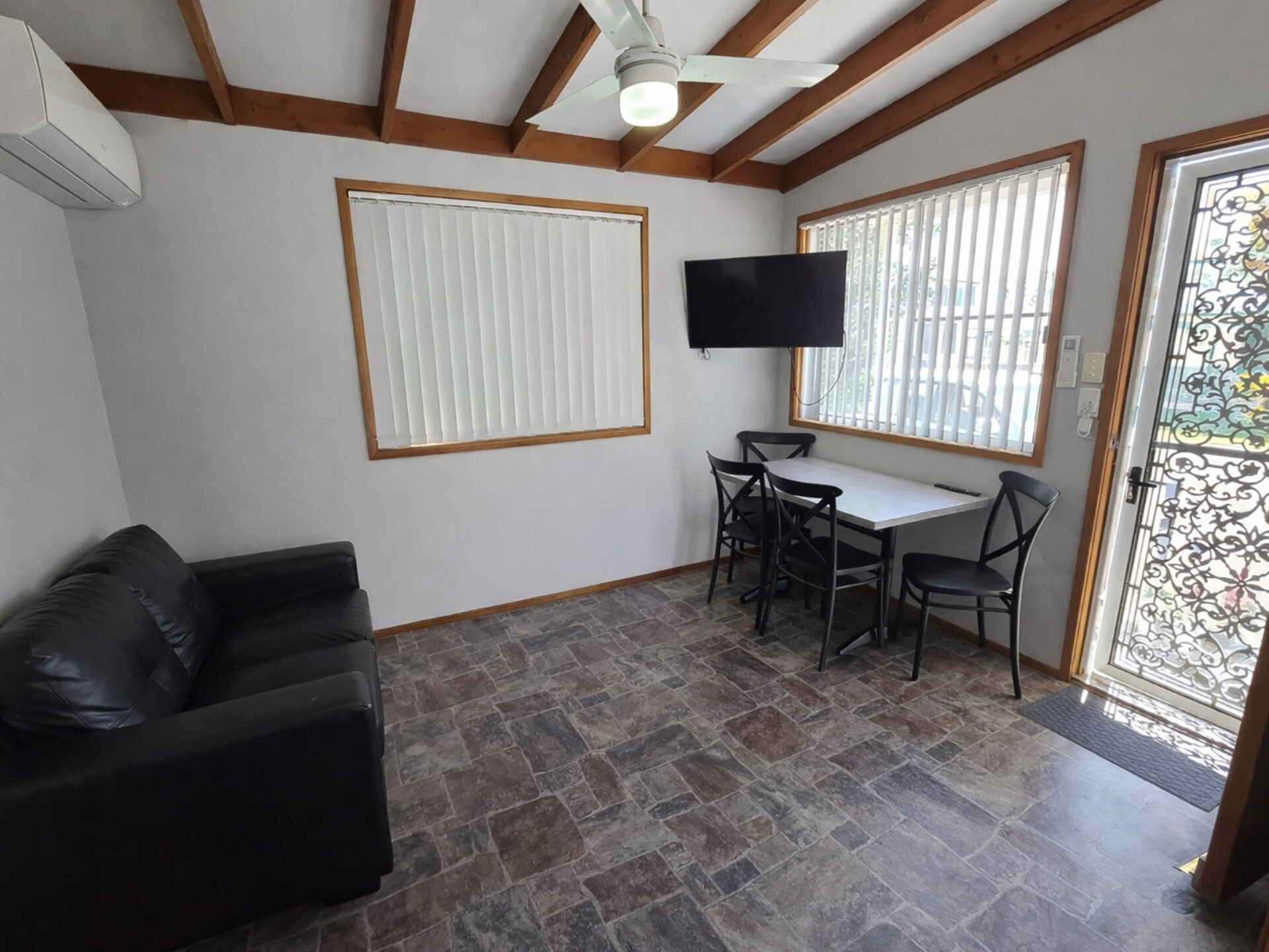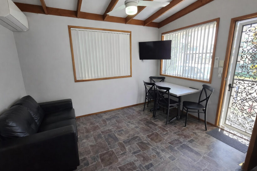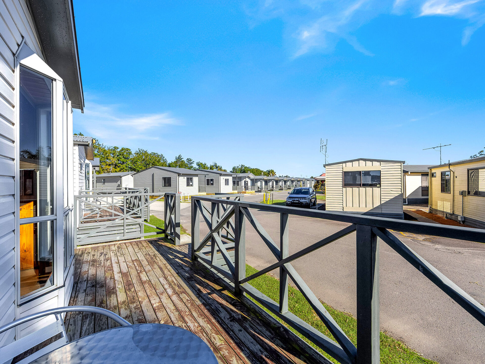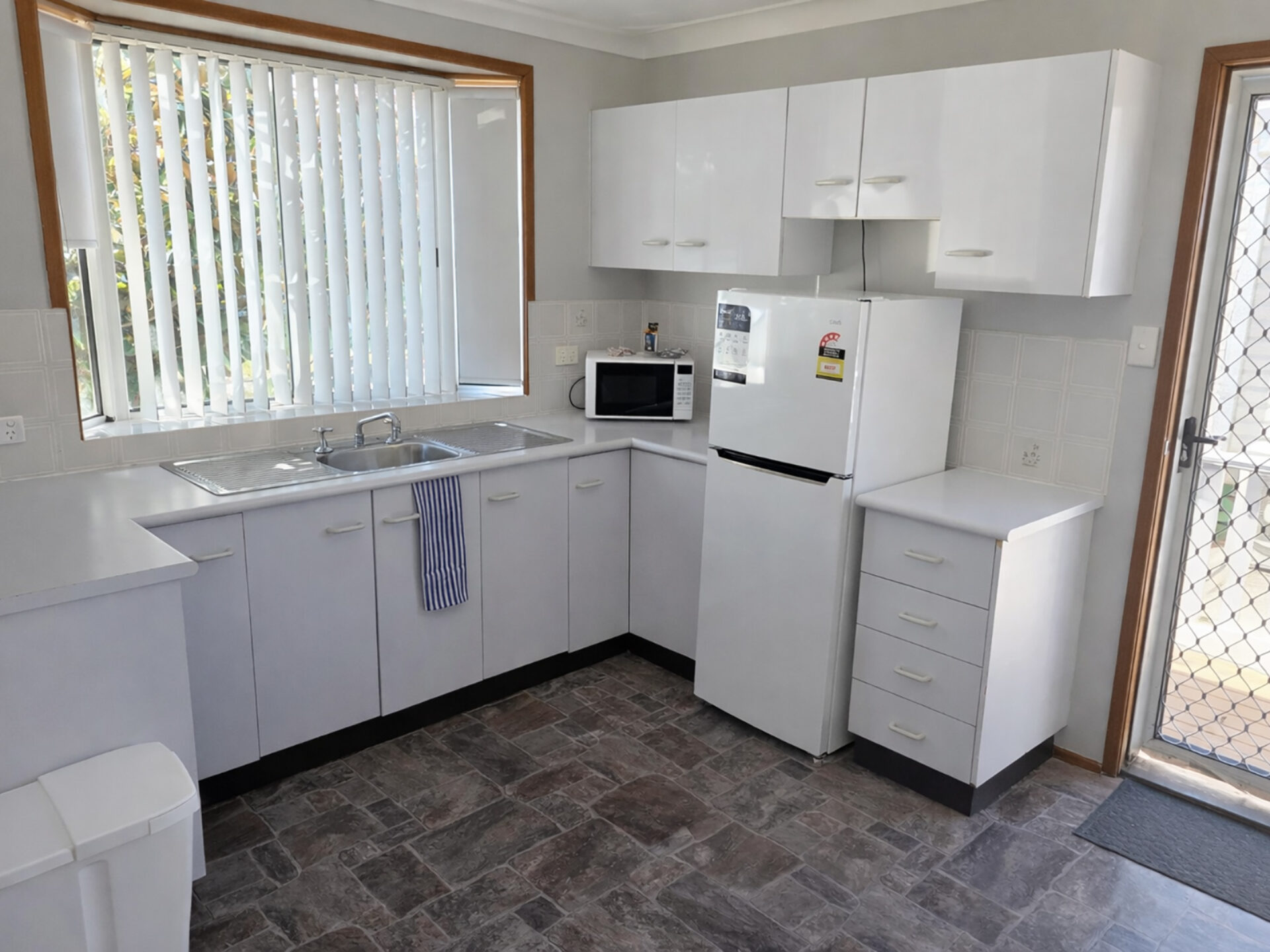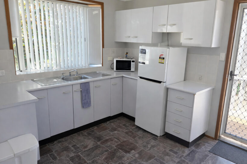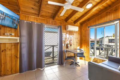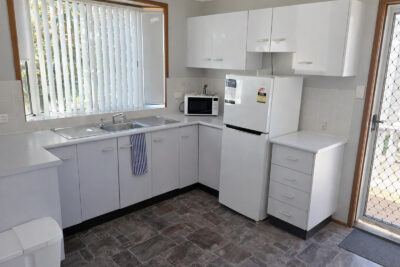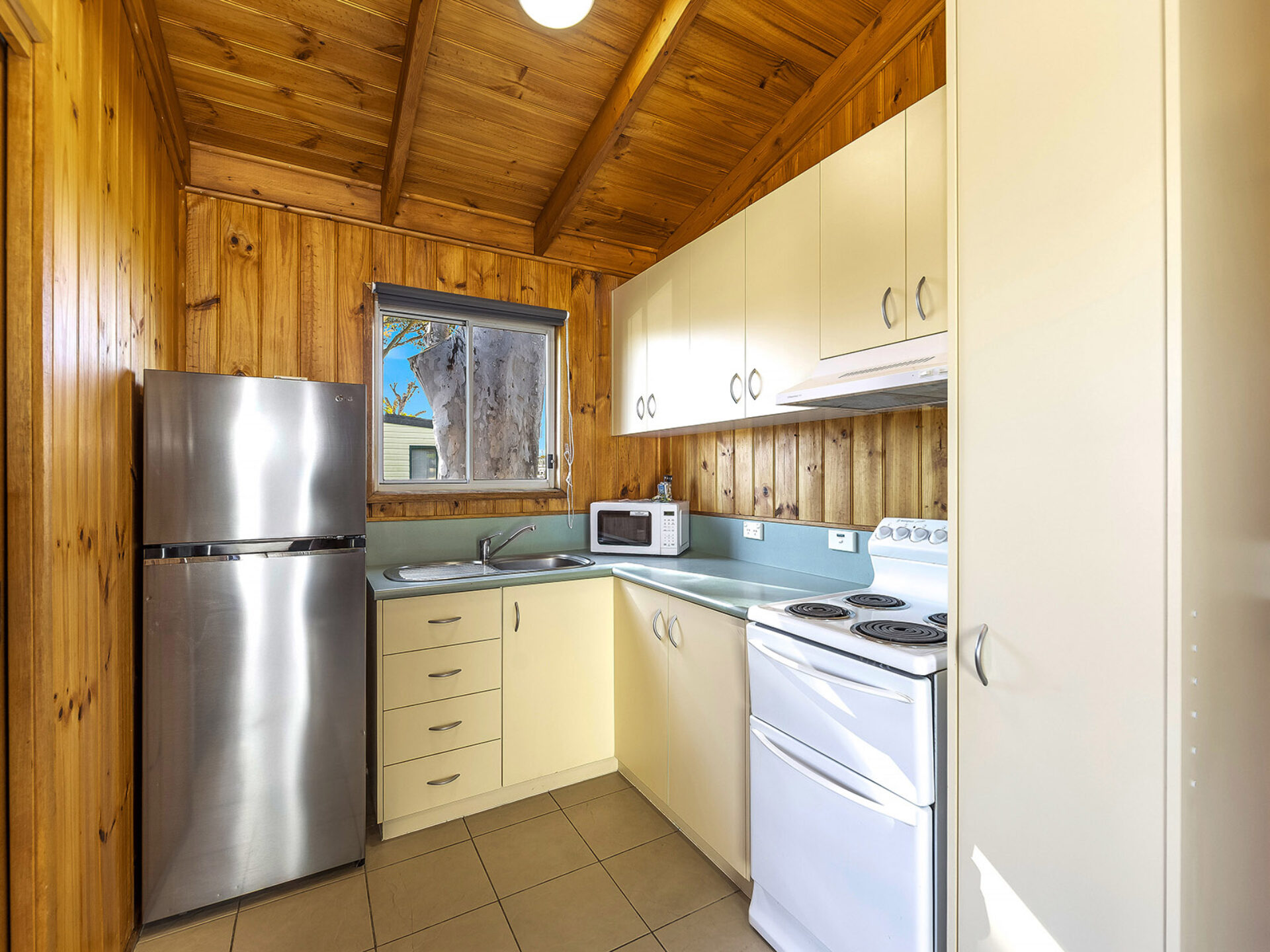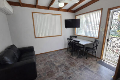 This two-bedroom villa sleeps up to four guests with a mix of bedding configurations, including two double beds. The air-conditioned living and dining area opens onto an outdoor deck. The kitchen is equipped with a gas or electric stovetop, a microwave, and a full-size fridge.