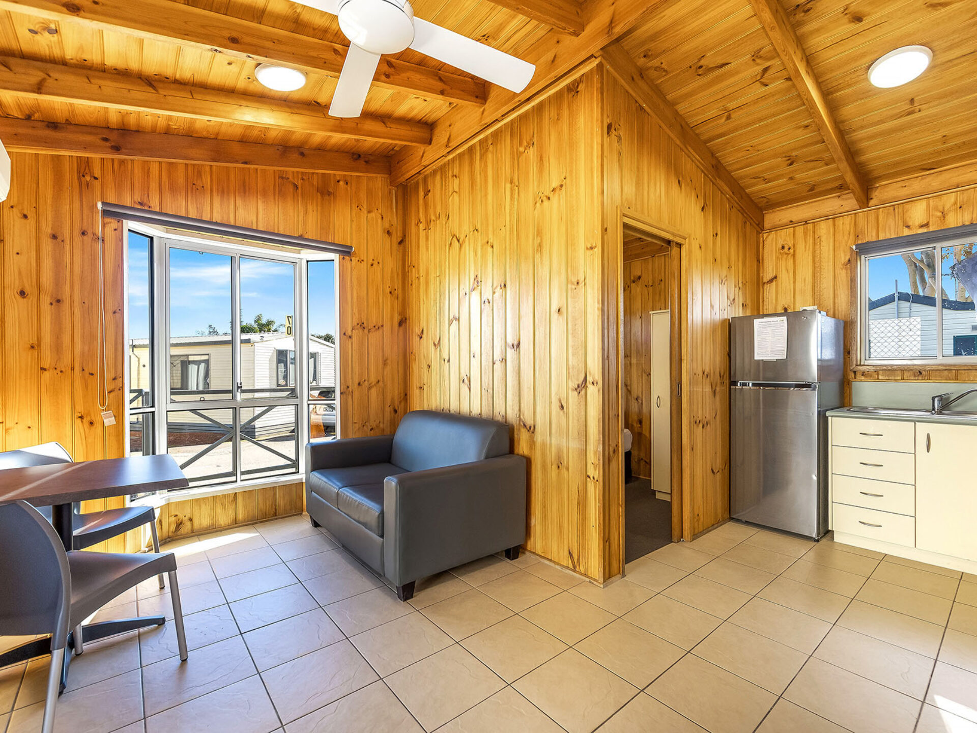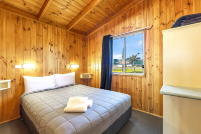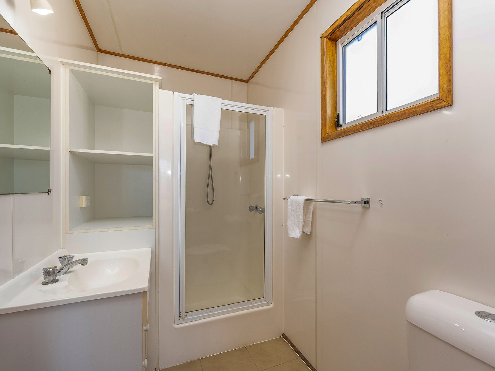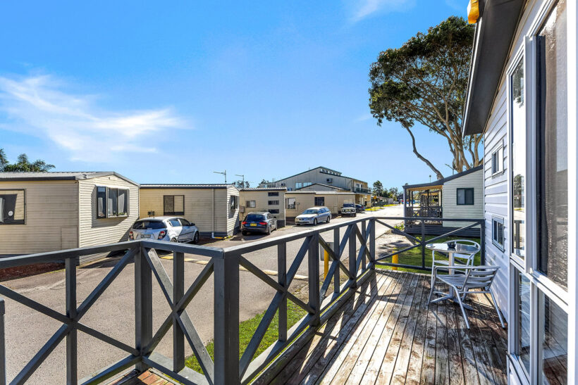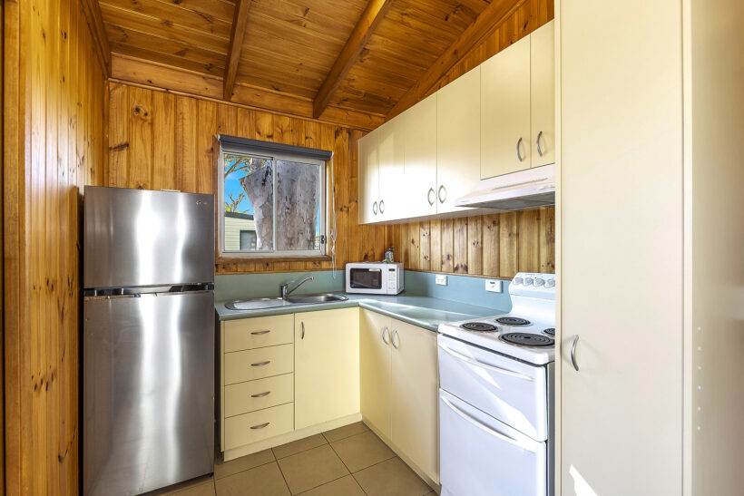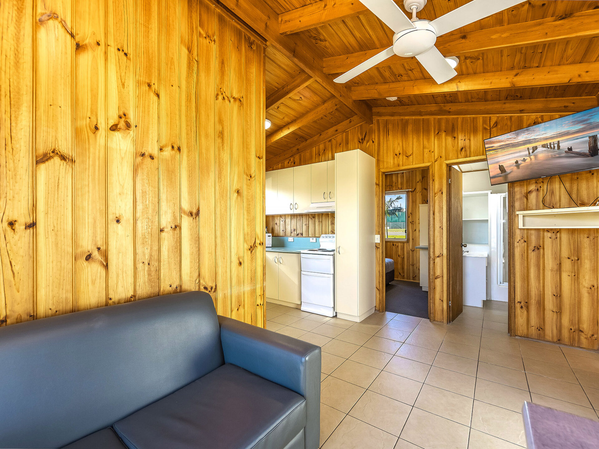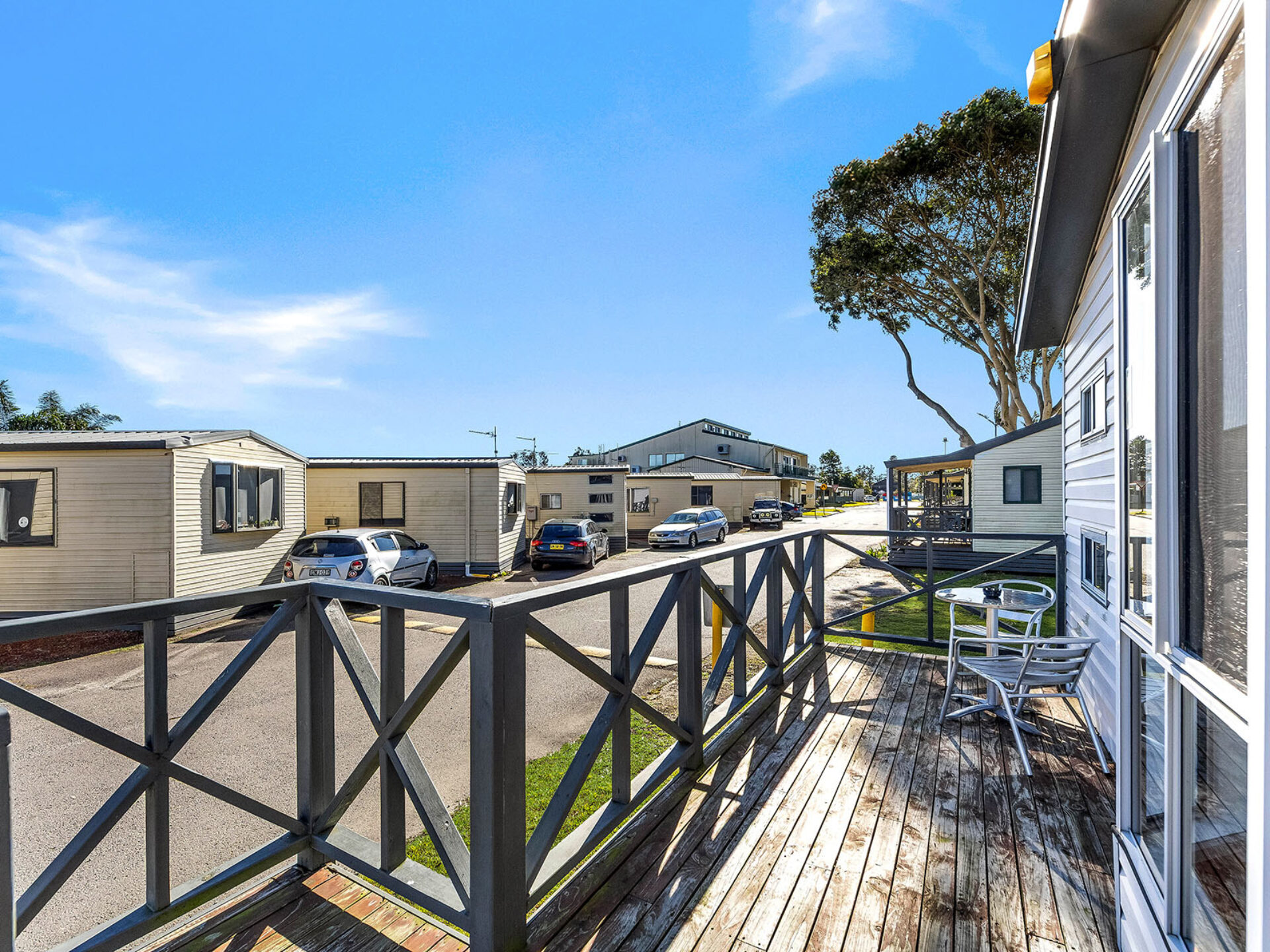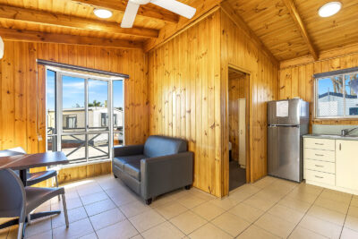 This two-bedroom villa sleeps up to four guests with a mix of bedding configurations, including two double beds. The air-conditioned living and dining area opens onto an outdoor deck. The kitchen is equipped with a gas or electric stovetop, a microwave, and a full-size fridge.