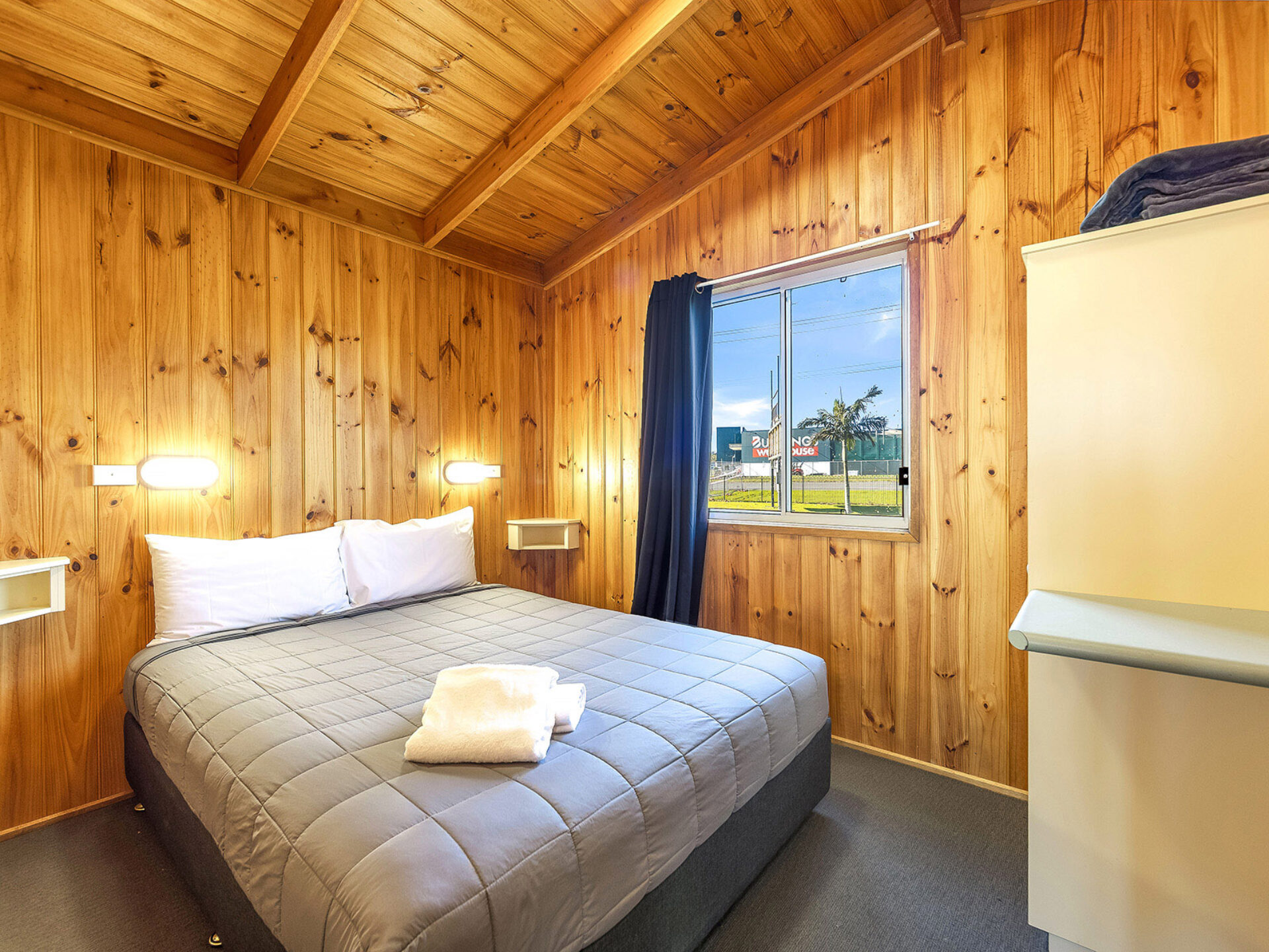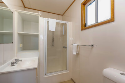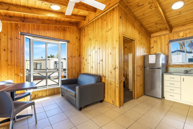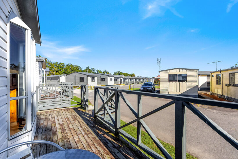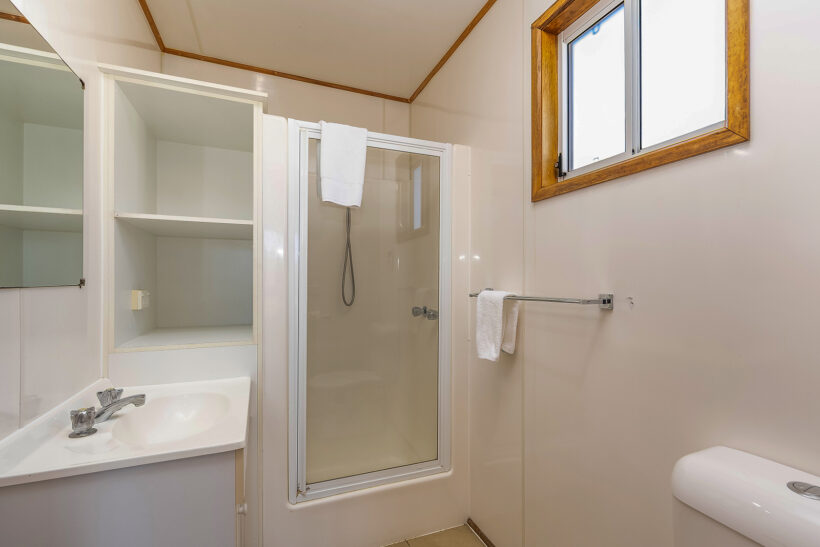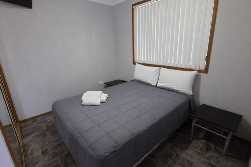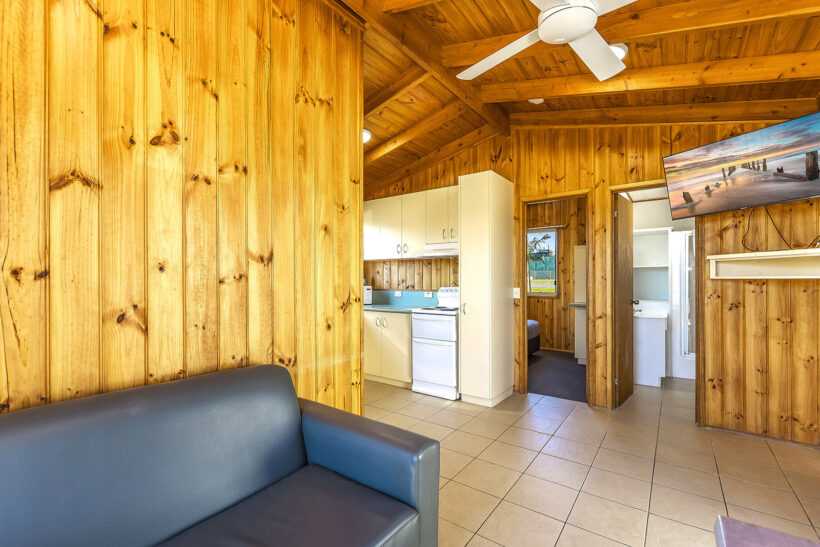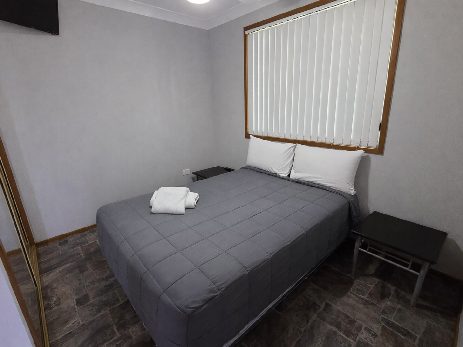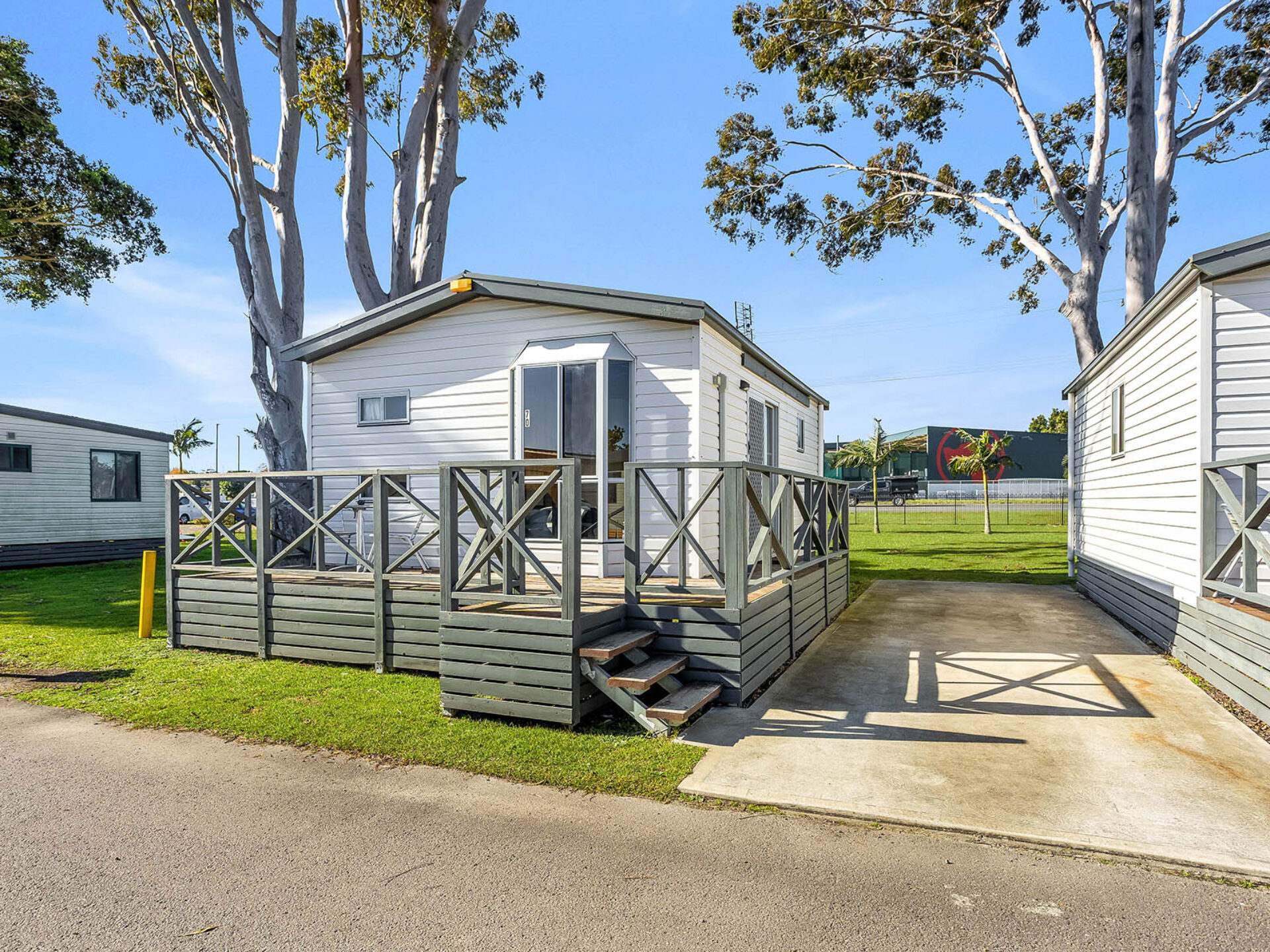 This two-bedroom villa sleeps up to four guests with a mix of bedding configurations, including two double beds. The air-conditioned living and dining area opens onto an outdoor deck. The kitchen is equipped with a gas or electric stovetop, a microwave, and a full-size fridge.