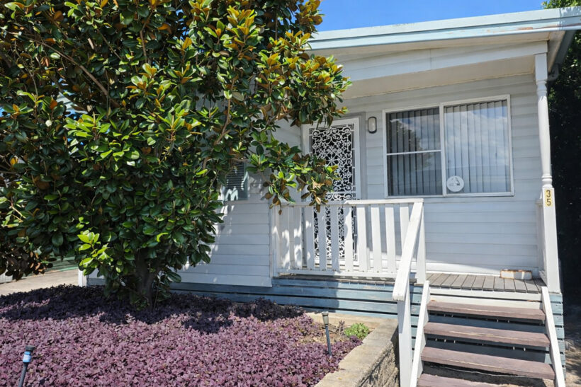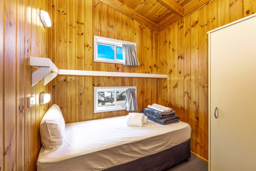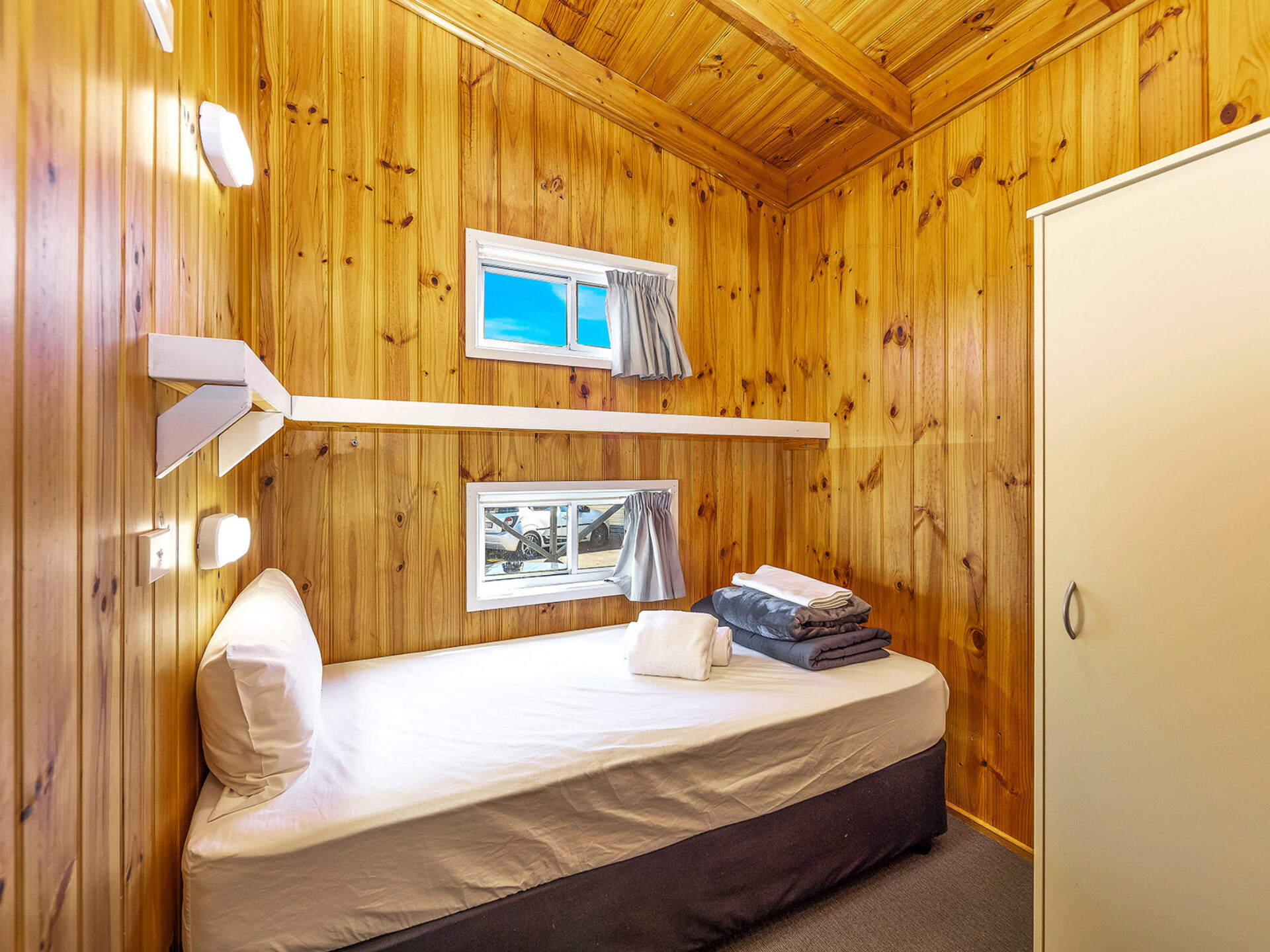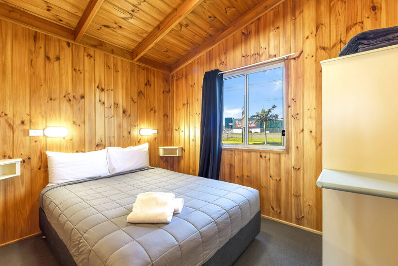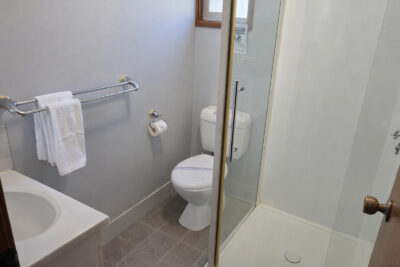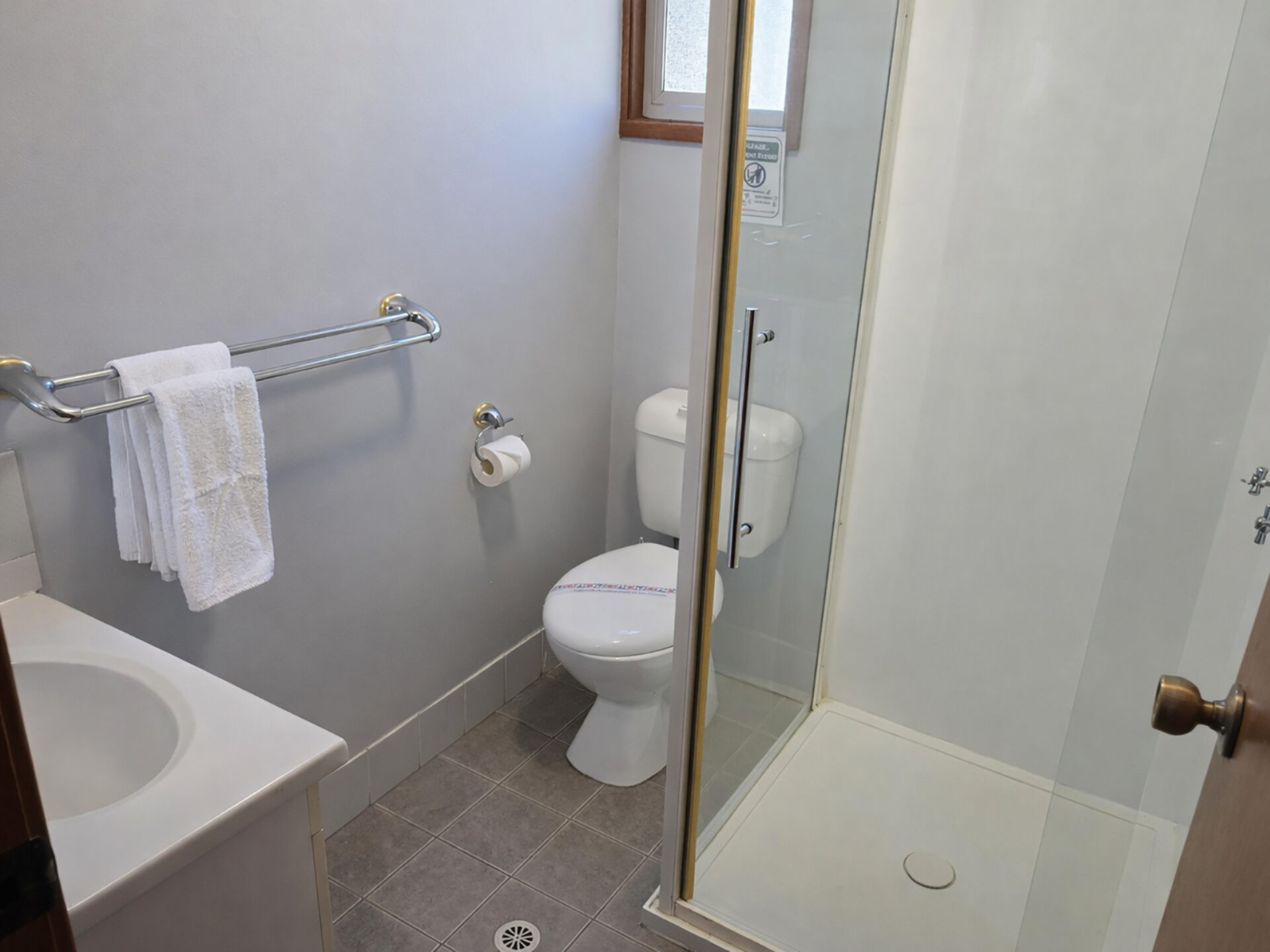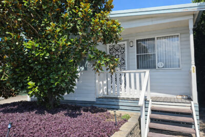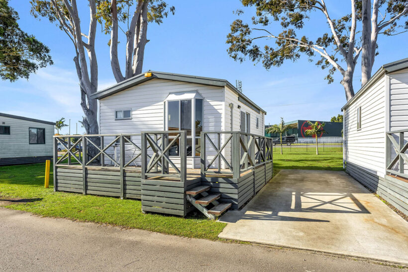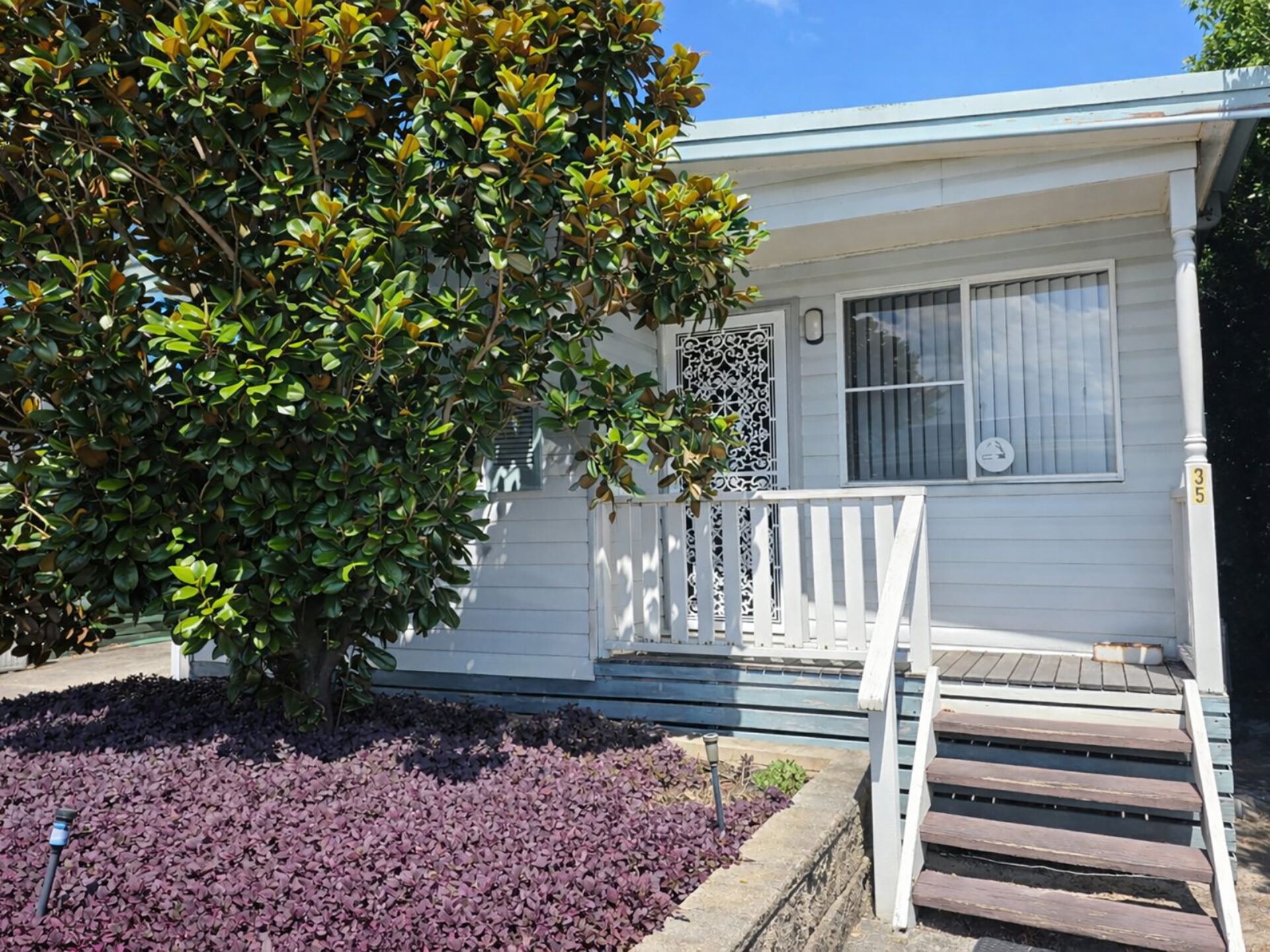 This two-bedroom villa sleeps up to four guests with a mix of bedding configurations, including two double beds. The air-conditioned living and dining area opens onto an outdoor deck. The kitchen is equipped with a gas or electric stovetop, a microwave, and a full-size fridge.